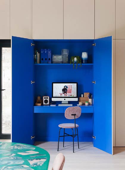 אופציה נוספת היא לשלב את פינת העבודה באופן נסתר, כחלק מעבודת הנגרות הכוללת. ניתן לתכנן פריט נגרות המכיל את פינת העבודה ובה בעת מאפשר לסגור אותה בדלתות. כאשר נרצה לעבור לפונקציה אחרת של החדר – שינה, אירוח, צפייה בטלוויזיה – פשוט נסגור את הדלתות, ונקבל רהיט דקורטיבי לכל דבר.